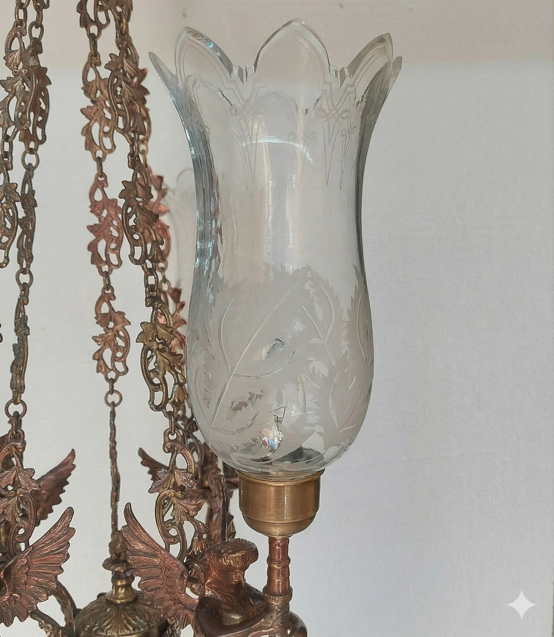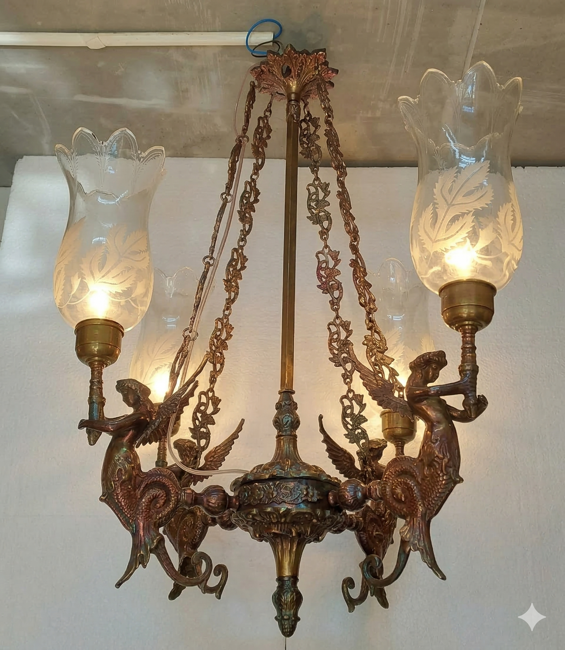 Rare Vintage Victorian Cut Glass Art Deco Nouveau Mermaid Light Old Lamp Ceiling Hanging Chandelier Fixture Brass & Cut Glass Light Antique